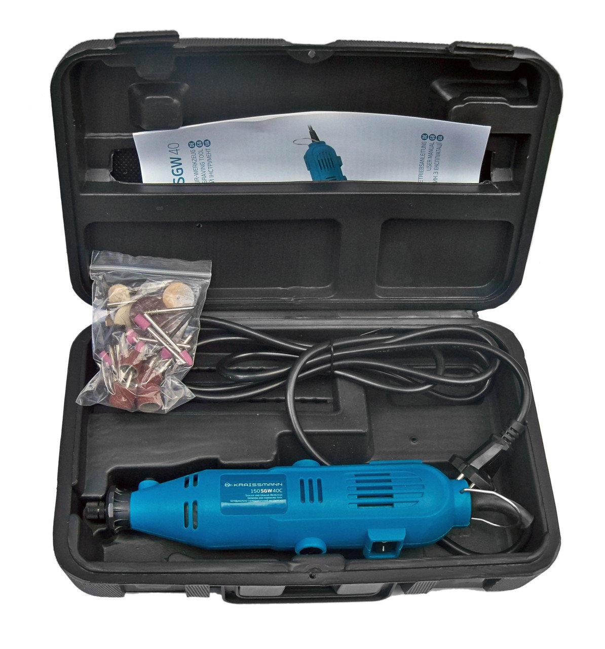 Гравер KRAISSMANN 150 SGW 40C має невелику вагу та маленькі розміри, але водночас він обладнаний досить потужним 150 Вт електромотором, який здатний підтримувати 10000-32000об/хв. Наявність регулювання обертів дає змогу працювати з різним матеріалом на потрібних обертах. Інструмент постачається в пластиковому кейсі з 40 насадками.