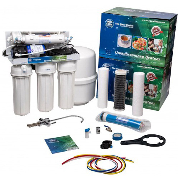 Aquafilter RP942141XXС НАСОСОМ 6 ступінчаста подмоечная система зворотного осмосу з мінералізатором. Система обладнана мембранним насосом для підвищення тиску подачі води , це ідеальний вибір, в тих випадках коли тиск в системі менше, ніж 2,8 бар. Виготовлений з сертифікованих компонентів NSF і WRAS. Завдяки високій якості мембрани можна очистити до 280 літрів води в день. Малий калібр мембрани 0,0001 мкм, дозволяє видалити більшість забруднень з води, включаючи бактерії і віруси. Система оснащена вугільним фільтром (AICRO), який покращує смак і запах води .А так само мінералізується картриджем, який збагачує воду такими елементами, як кальцій і магній